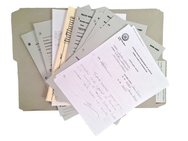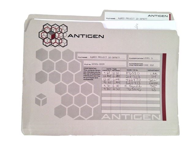 Antigen' Lab file folder with 'Antigen' name, logo, and project information printed on front, in and out times and ID numbers handwritten on front as well, and over 15 pages of paperwork within (12"x10").