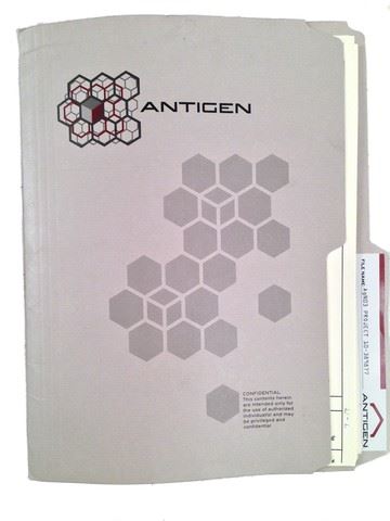 Antigen' Lab file folder with 'Antigen' name, logo, and design on front and over 20 pages of paperwork within (12"x10").