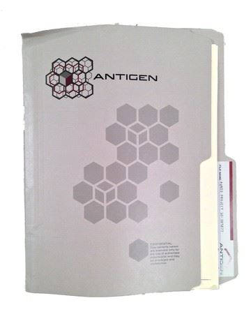 Antigen' Lab file folder with 'Antigen' name, logo, and design on front and over 10 pages of paperwork within (12"x10").