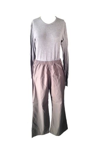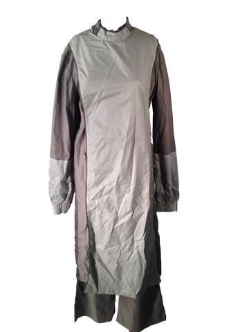 Antigen ladies laboratory outfit, including: long white Antigen lab coat with Antigen name and logo, long grey and teal surgical gown, grey short sleeve scrub top with two buttons in back (Size mm), grey scrub pants, grey American Apparel long sleeve sweatshirt (size sm), grey surgical beanie.
