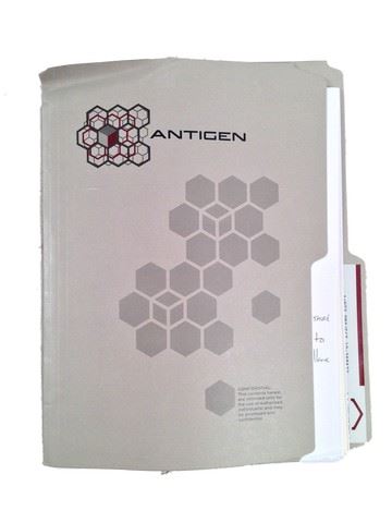 Antigen' Lab file folder with 'Antigen' name, logo, and design on front and over 10 pages of paperwork within (12"x10").