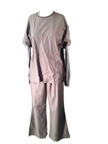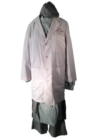 Antigen Men's laboratory outfit - long white Antigen lab coat with Antigen name and logo, long grey and teal lab surgical gown, grey short sleeve scrub top with two buttons in back, grey scrub pants, grey American Apparel long sleeve sweatshirt (size L) and grey surgical beanie.