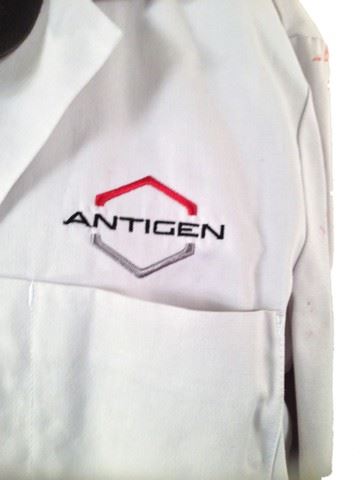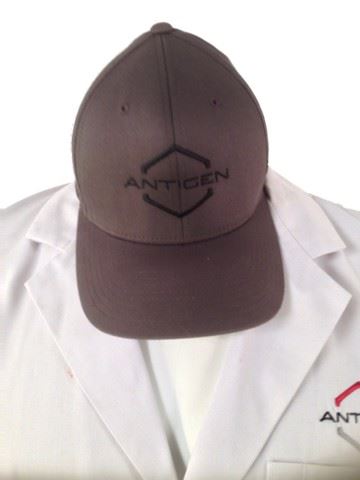 Screen worn, Antigen med tech outfit, grey"Flexfit" antigen hat(S-M), white antigen lab coat with the antigen logo on the left breast, coat is splattered in blood by production mainly on the left arm,(42), grey gortex pants inside label reads"Lebrone F"(32-34).