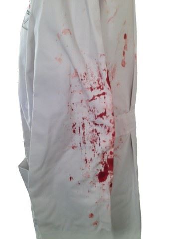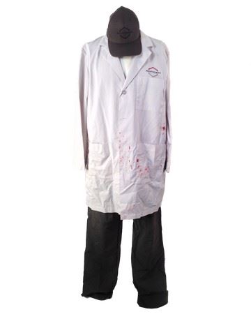 Screen worn, Antigen med tech outfit, grey"Flexfit" antigen hat(S-M), white antigen lab coat with the antigen logo on the left breast, coat is splattered in blood by production mainly on the left arm,(42), grey gortex pants inside label reads"Lebrone F"(32-34).