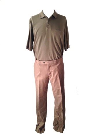 Antigen Scientist costume, including: long white Antigen lab coat with Antigen name and logo on front, 'Blue Pronto Uomo' khaki polo shirt (size L), 'Zara' brown slacks (size 34), brown 'Dockers' mottled leather belt (size 36), brown 'Ronsports' dress shoes (size 11). Includes wardrobe tag.