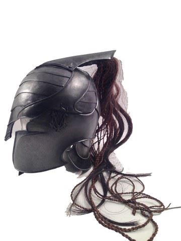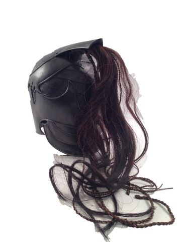 Plastic Death Dealer Helmet with raised symbol design on both sides, leather chin strap beneath, synthetic hair, and thin braids of string on the backside. There is a 7" crack on the left side of the helmet. From Underworld: Rise of the Lycans. (12x10x6)