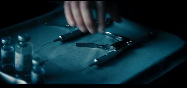 Dr. Jacob Lane (Stephen Rea) screen used trigger operated hypodermic metal syringe with retractable needle. Used on screen on Quint. Includes plastic cover for needle. (8.5x4).