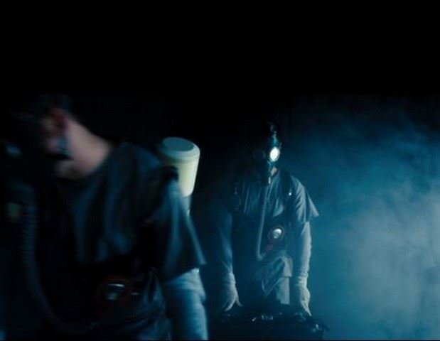 Screen worn rubber Gas Mask with hose, metal mouthpiece and glass eye pieces. Worn by Antigen Personnel while wheeling Eve (India Eisley) from the Antigen Lab. Condition may vary slightly.