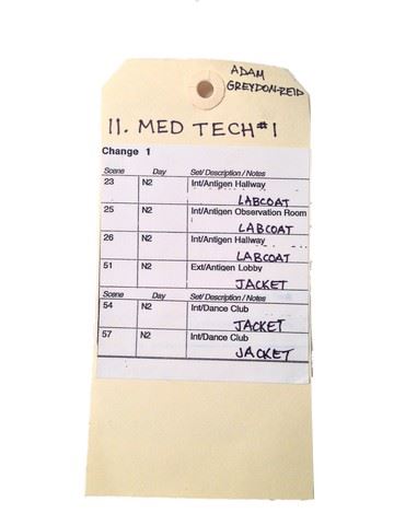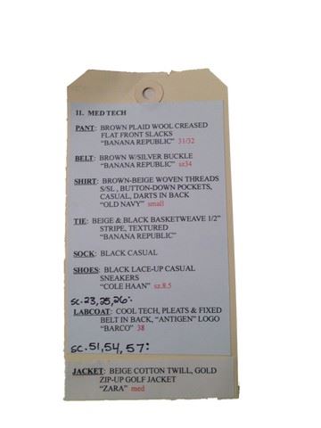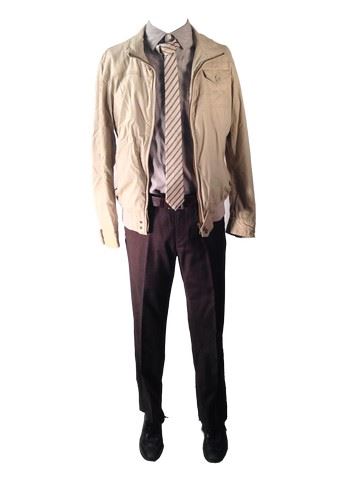 Med Tech outfit, including: 'Banana Republic' slacks (size 31/32), 'Old Navy' short sleeve woven thread shirt (size S/SL), 'Zara Man' cotton twill jacket (size M), 'Banana Republic' basketweave tie, 'Cole Haan' black lace up sneakers (size 8.5). From Underworld: Awakening.