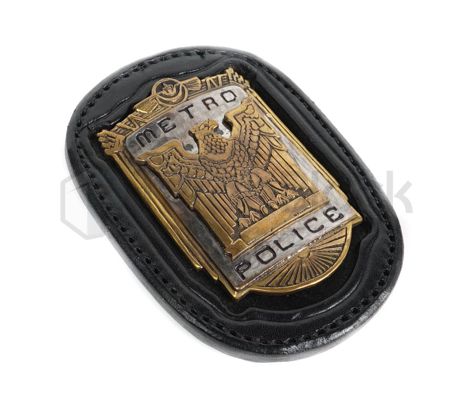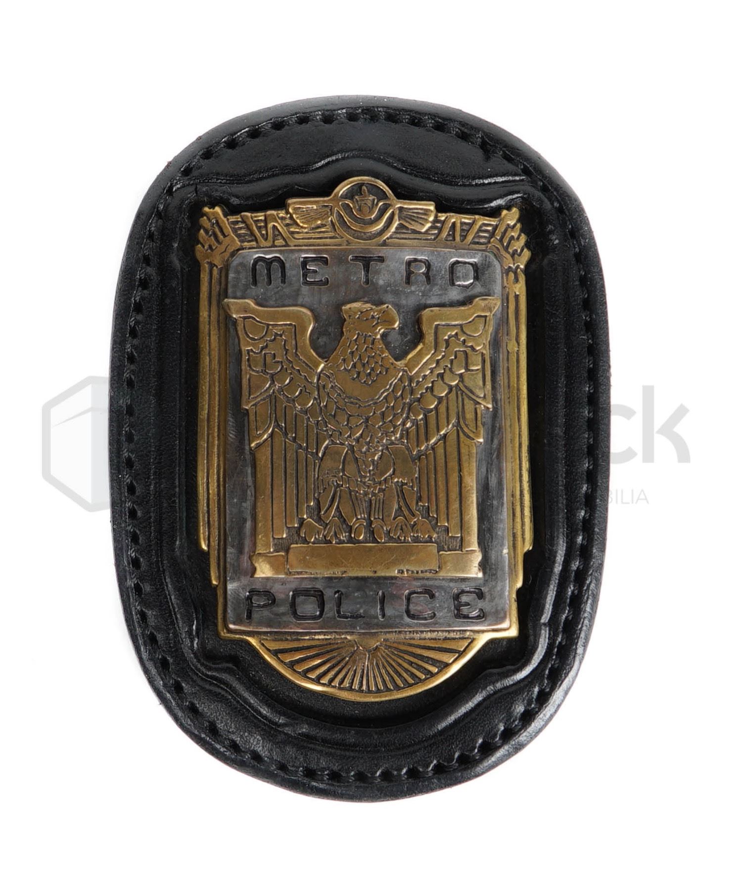 Metro police badge featured in the 2012 science fiction horror film Underworld: Awakening. When human forces discover the existence of the Vampire and Lycan clans, a war to eradicate both species commences. The vampire warrior Selene leads the battle against humankind. This badge was sued by one of the police officers who investigates in Metro City. The badge is made of cast metal, two layers, one gold and the other silver. It sits inside a custom made black leather wallet with belt attachment. This piece remains in excellent, production used condition.