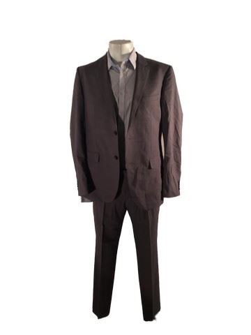 Sebastian (Michael Ealy) screen worn, stunt, grey "Hugo Boss" suit jacket with matching pants, grey wool vest, dark blue "Hugo Boss" tie with light blue stripes, blue "Zara Man" dress shirt, black "Mountain Equipment" pants worn under grey suit pants for warmth, soiled and torn slightly by production, used in the fight scene falling in the puddle, all item labeled "Sebastian Stunt.