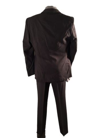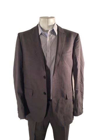 Sebastian (Michael Ealy) screen worn, stunt, grey "Hugo Boss" suit jacket with matching pants, grey wool vest, dark blue "Hugo Boss" tie with light blue stripes, blue "Zara Man" dress shirt, black "Mountain Equipment" pants worn under grey suit pants for warmth, soiled and torn slightly by production, used in the fight scene falling in the puddle, all item labeled "Sebastian Stunt.