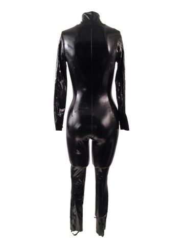 Selene (Kate Beckinsale) screen worn, stunt double, black latex catsuit with stirrups at the feet. Small hole in the left knee. Production distressed. Inside sleeve reads "Angela" hand written in marker.