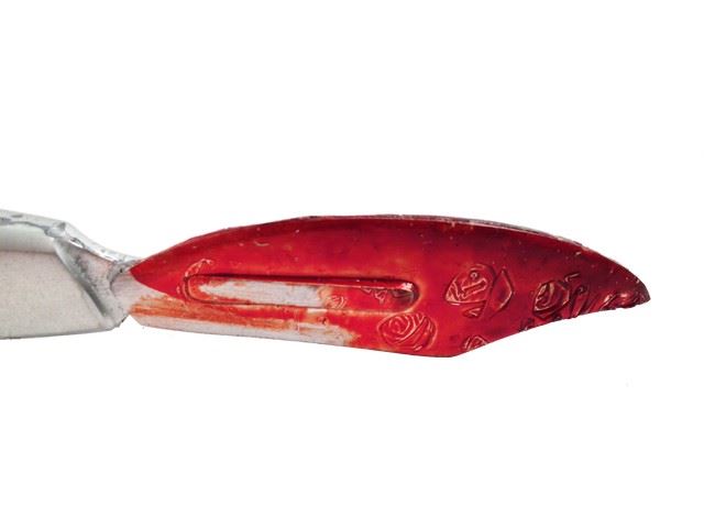 Selene's (Kate Beckinsale) hero, bloody scalpel. Made of plastic. There are bits of wax paper stuck to parts of the bloody tip. (7" long).