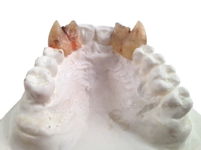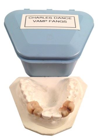 Thomas (Charles Dance) screen worn, prosthetic vampire fangs with casting mold and plastic case. Also used in Blood Wars.