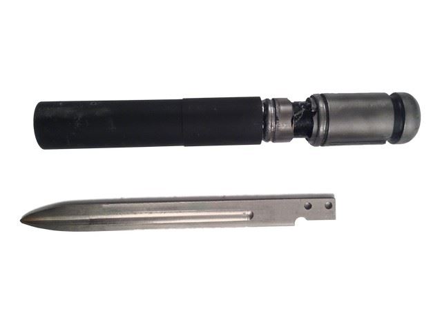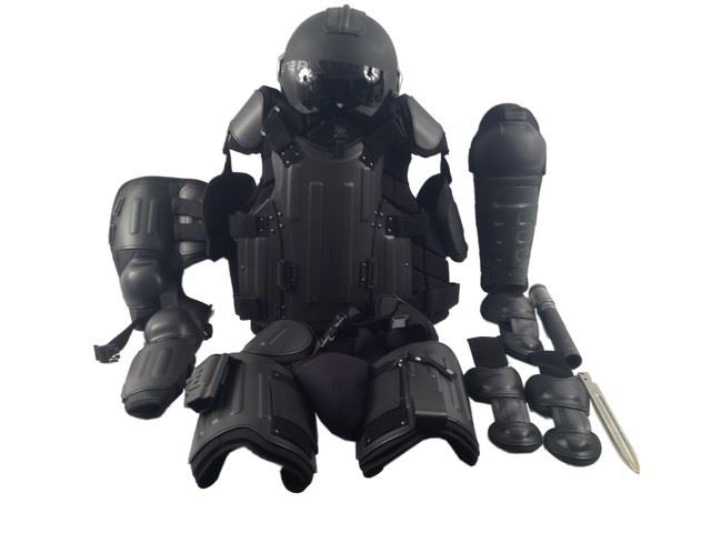 Screen worn Troopers SWAT gear including: helmet with visor, chest piece with arm guards, side leg armor with gun holster and belt, shin guards, toe guards, metal with resin baton, rubber blade and black bag.
