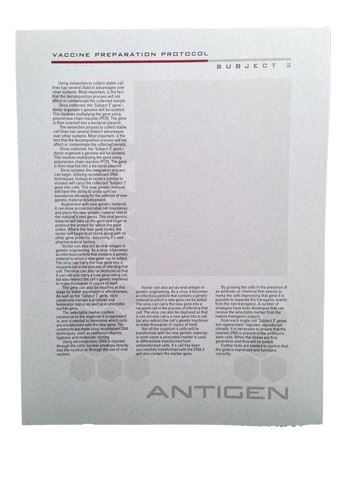 Screen used 'Subject 2' page from the Antigen Laboratory 'Vaccine Preparation Protocol' file, printed on grey stationary paper (11x8.5).