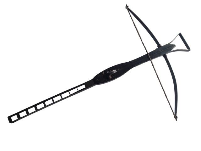Screen used large black metal crossbow with leather strap detailing on either side of arrow rest (approx. 44"x26")
