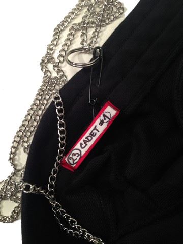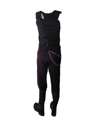 Male Cadet outfit, including: black pants with silver colored chain attached at the waist, 2 'Basic' black tanks, heavy textile vest with shoulder straps and buckles, leather 'Zara Man' boots (EU size 43), military style belt, cloth and leather bands. This is the only costume of this kind available from production.