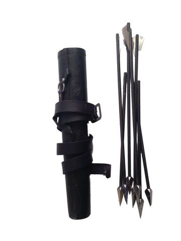 Screen used black leather quiver bag with adjustable strap, silver resin detailing and 7 arrows with foam arrowhead, wooden shaft and plastic fletching (some arrows damaged) (bag approx 17"x 3")