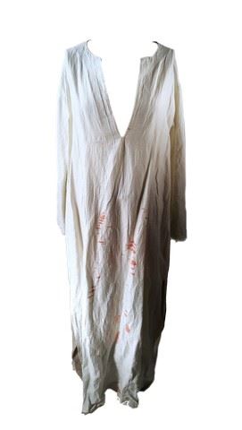 Vidar (Peter Andersson) screen worn, custom made, long cream colored tunic with blood splatter on front, tan pants with loops for a belt, tan leather belt with velcro on the end for attachment. This is the only costume available for Vidar.