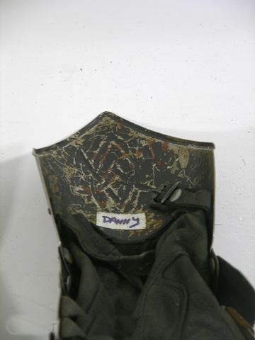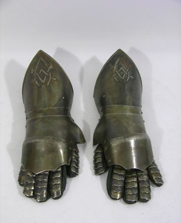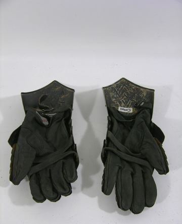Death Dealer's metal hand armor with black leather gloves. (pair labeled "Danny" )