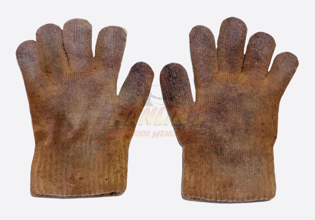 Original bloody peasant gloves worn in the opening medieval battle sequence from the action horror film 'Underworld: Evolution' (2006), where vampire warrior Selene and the half werewolf Michael hunt for clues to reveal the history of their races and the war between them.