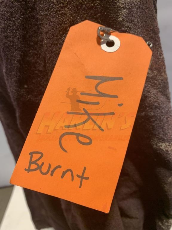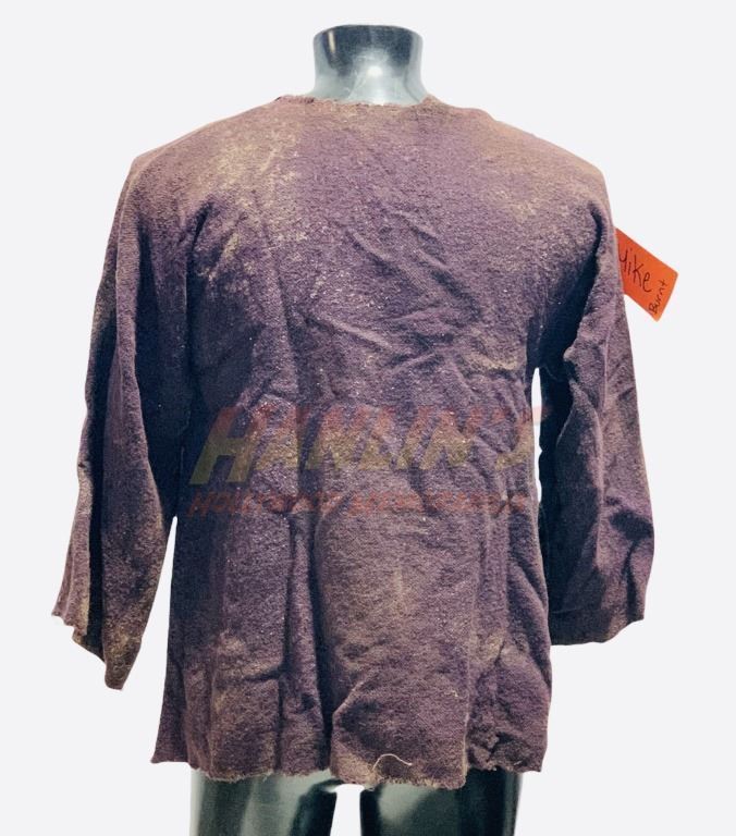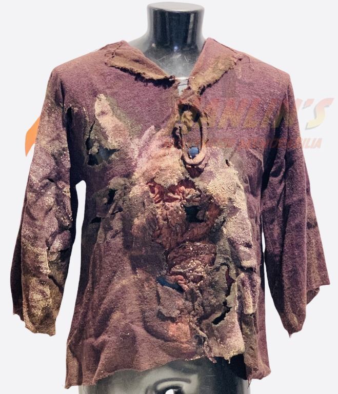 Charred and bloodstained maroon long sleeve tunic screen worn during the opening medieval village sequence. The tunic has a v-neck with ties at chest, frayed edges, and features red stained mesh to simulate flesh wound on front center. The shirt is also extremely bloodstained.