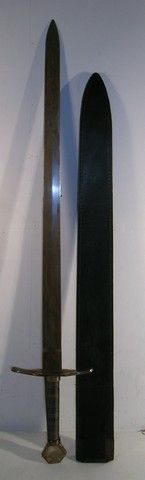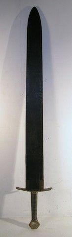 From the set of 'Underworld: Evolution' (2006), this is an Elder Death Dealer Sword. Starring Kate Beckinsale, the film is about Selena (Beckinsale) searching for clues for why the vampires and Lycans are fighting each other. The film opens with a flashback to centuries prior, where in which Death Dealers hunt for Lycans. In addition to having a metal blade, the sword also has a wire spun handle and leather sheath. Oversized item. Additional postage required. (approx. 40" long)