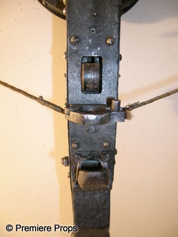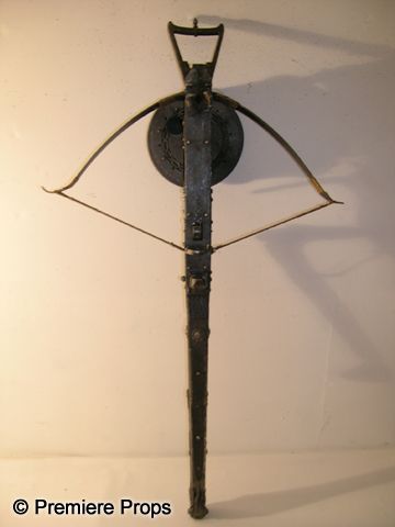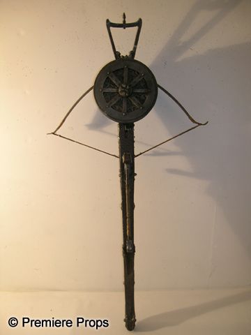 From 2006's 'Underworld: Evolution,' this is a screen used, hero Death Dealer Crossbow. The crossbow is made from heavy wood, with a wooden handle and metal bow, and has metal trim attachments and a chain piece. (measures approx. 47"x26"x10") Oversized item. Additional Postage Required.