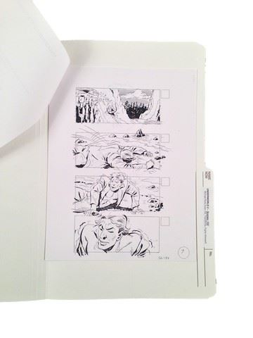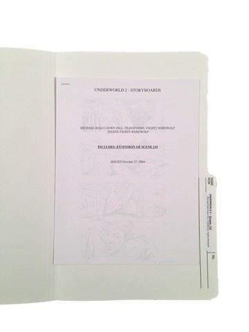 Underworld: Evolution Production Storyboards with six pages of action packed detailed illustrations for scene 133 which depicts Michael (Scott Speedman) rolling down a hill and transforming into a werewolf, while Selene (Kate Beckinsale) fights and ultimately stabs another werewolf in the head. Five of the six pages contain four seperate storyboard panels each, while the last page contains one storyboard panel. (8.5x11).