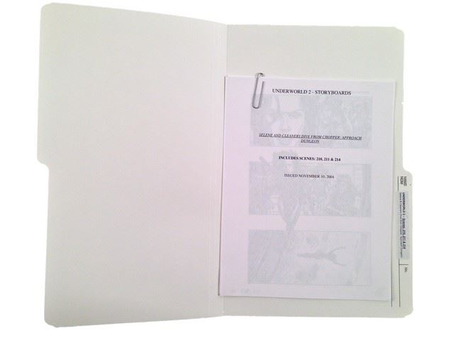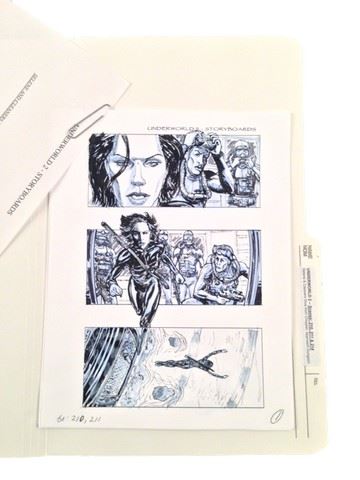 Underworld: Evolution Production Storyboards with eight pages of action packed detailed color and B & W illustrations for scenes 210, 211 and 214 which depict Selene (Kate Beckinsale) and the 'Cleaners' diving into a pool of water form a helicopter and approaching the dungeon. Six of the eight pages contain three storyboard panels each while two of the pages contain two panels each (8.5x11).