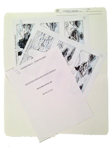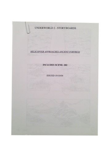 Underworld: Evolution Production Storyboards with two pages of action packed detailed color and B & W illustrations for scene 202 which depicts a helicopter approaching the ancient fortress. There are three storyboard panels on each page (8.5x11).