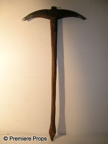 A screen used battle pick axe from 2006's 'Underworld: Evolution.' The axe is made with a straight wooden handle and is tapered off into a pointed tip for 'vampiric' purposes, and is affixed to a detailed, hard rubber dual axe head. (measures approx. 40" long) Oversized item. Additional Postage Required.