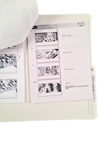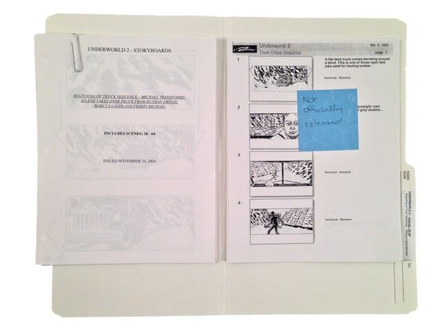 Underworld: Evolution Production Storyboards with 16 pages of detailed color and B&W illustrations for scenes 58-64, and 15 pages of illustrations for a 'Truck Chase Sequence' with a "Not Officially Released" post-it from the studio attached (8.5x11).