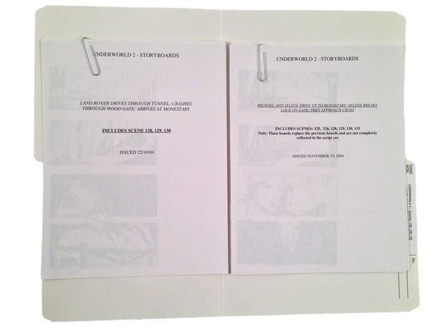 Underworld: Evolution Production Storyboards with nine pages of detailed color and B&W illustrations for scenes 125,126,128,129,130 and 133, and five pages of B&W illustrations for scenes 128,129 and 130 (8.5x11).
