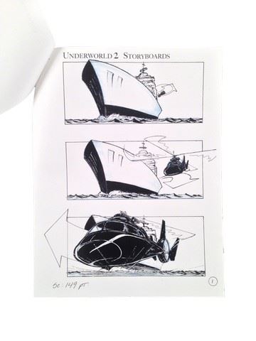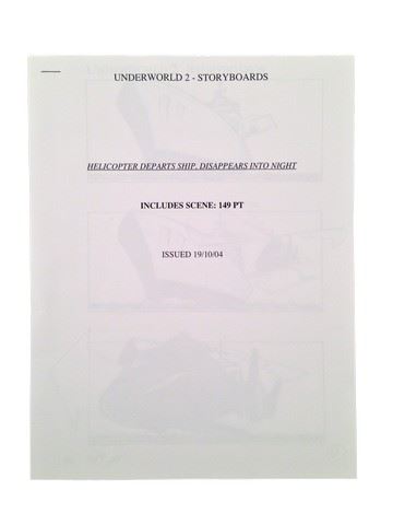 Underworld: Evolution Production Storyboard with one page of action packed detailed color illustrations for scene 149PT which depicts a helicopter lifting off from a ship and flying away. The page contains three storyboard panels (8.5x11).
