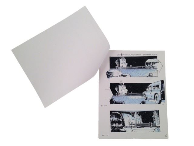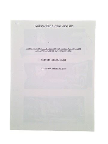 Underworld: Evolution Production Storyboards with six pages of action packed detailed color illustrations for scenes 160 and 161 which depict Selene (Kate Beckinsale) and Michael (Scott Speedman) arriving at the 'Sancta Helena' where they are confronted by a Guard with a high powered weapon in one hand and a wild dog leashed in the other. Four of the six pages contain three storyboad panels each while, two of the pages contain two storyboard panels (8.5x11).