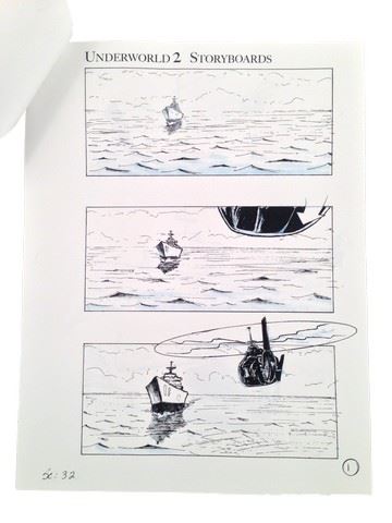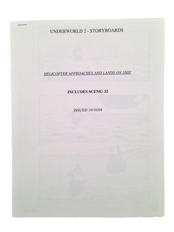 Underworld: Evolution Production Storyboards with two pages of detailed color and B&W illustrations for scene 32 which depicts a helicopter approaching and landing on a ship. There are three storyboard panels on each page (8.5x11).