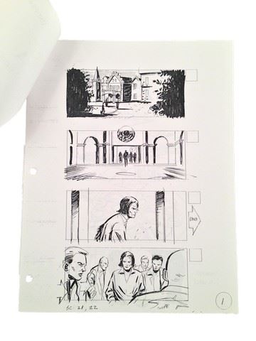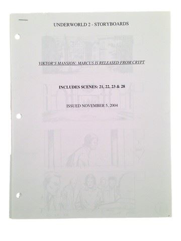 Underworld: Evolution Production Storyboards with 16 pages of action packed detailed illustrations for scenes 21,22,23 & 28 which depicts a winged Marcus (Tony Curran) being released from his crypt in Viktor's (Bill Nighy) mansion then wiping out everyone in sight.15 of the 16 pages contain four storyboard panels each while the last page contains two panels (8.5x11).