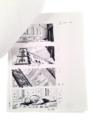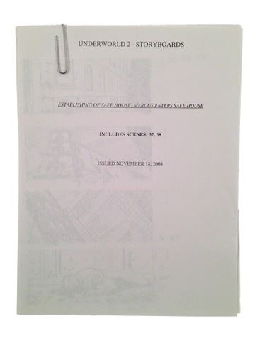 Underworld: Evolution Production Storyboards with seven pages of action packed detailed illustrations for scenes 37 & 38 which depict Marcus (Tony Curran) walking over dead bodies while entering his safe house for the first time. Six of the seven pages contain four storyboard panels each while the last page contains three panels (8.5x11).