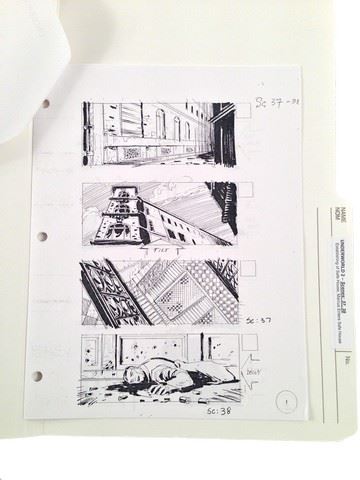 Underworld: Evolution Production Storyboards with seven pages of action packed detailed illustrations for scenes 37 & 38 which depict Marcus (Tony Curran) walking over dead bodies while entering his safe house for the first time. Six of the seven pages contain four storyboard panels each while the last page contains three panels (8.5x11).