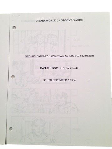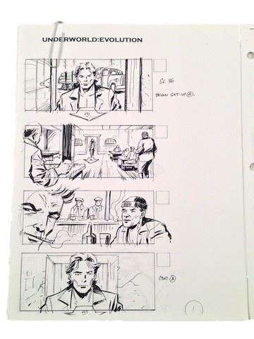 Underworld: Evolution Production Storyboards with two sets (9 pages each) of action packed detailed illustrations for scenes 36 and 42-45 which depicts Michael (Scott Speedman) entering a tavern where he is spotted by cops and forced to fight his way free. There are four storyboard panels per page (8.5x11).