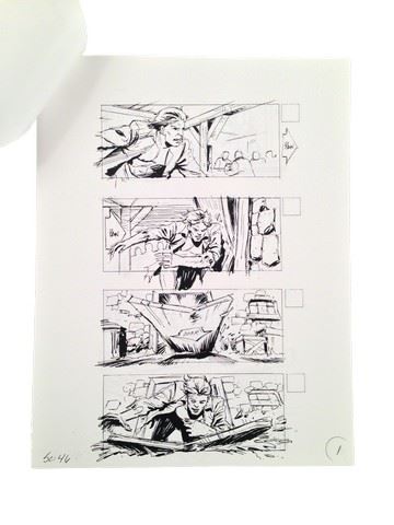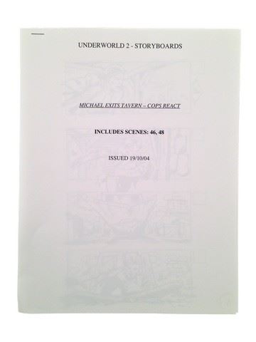 Underworld: Evolution Production Storyboards with seven pages of action packed detailed illustrations for scenes 46 & 48 which depicts Michael (Scott Speedman) fighting his way out of a tavern with Cops in pursuit. Six of the seven pages contain four storyboard panels each while the last page contains one panel (8.5x11).