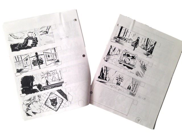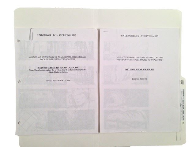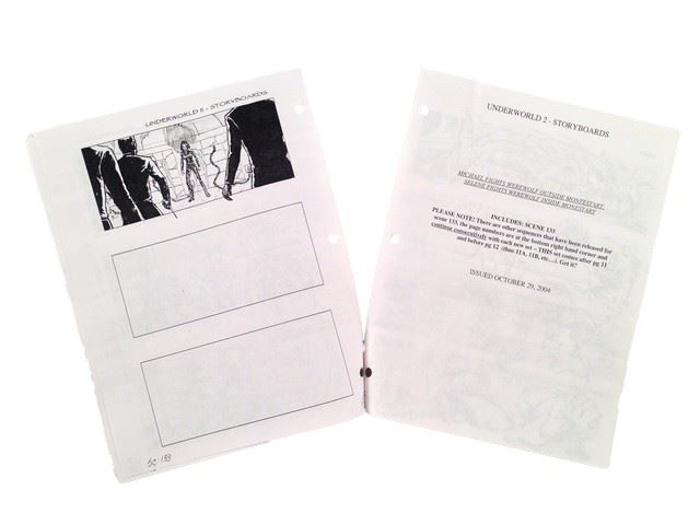 Underworld: Evolution Production Storyboards with 11 pages printed front and back and 5 pages printed front only with detailed illustrations for scenes 125,126,128,129,130 and 133 which depicts Selene (Kate Beckinsale) and Michael (Scott Speedman) approaching a monestary where Selene breaks the lock and they approach a cross (8.5x11).