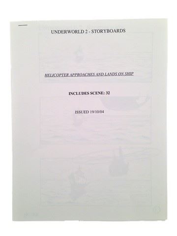 Underworld: Evolution Production Storyboards with two pages of detailed color and B&W illustrations for scene 32 which depicts a helicopter approaching and landing on a ship. There are three storyboard panels on each page (8.5x11).