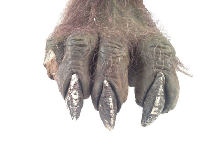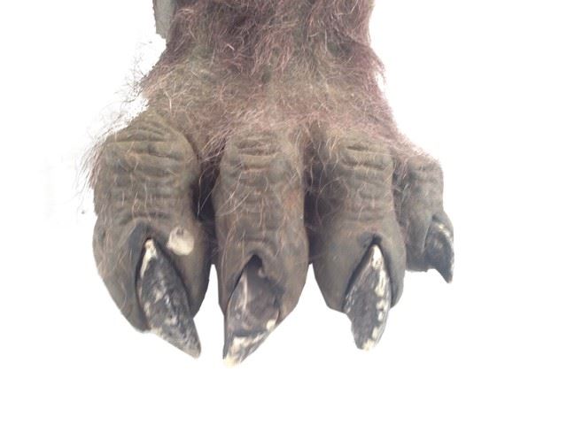Screen used, greyish brown foam lycan feet. Has fur on the ankles and calves and claws made out of resin. The right foot's fourth toe is torn and is missing the nail. The left foot's first toe is chipped and its second nail is also chipped. Both shin pieces labeled with " MANA". Used in Underworld: Rise of the Lycans, Awakening and Blood Wars. Last one available! (Approx. 28" x 12")