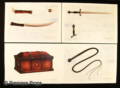 4 pieces of color artwork detailing the design of the following props used in the movie; Lucian's (Michael Sheen) found scythe, Sonja's (Rhona Mitra) dagger, a silver tipped whip, and a heavy box for silver. The edges of the paper are slightly bent. (16.5x11.75 each)