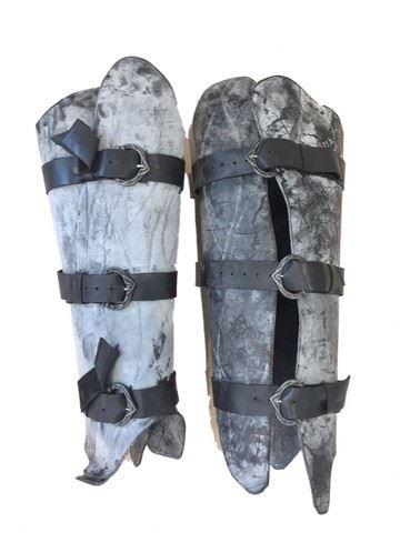 Death Dealer pieces, includes leg greaves with black leather straps and buckles.