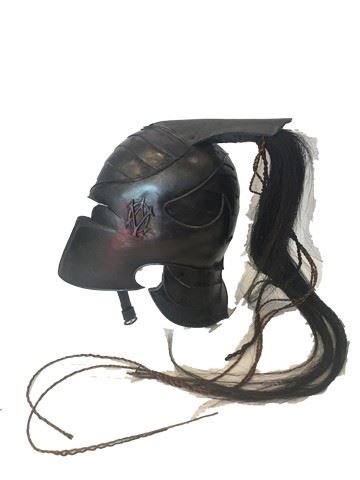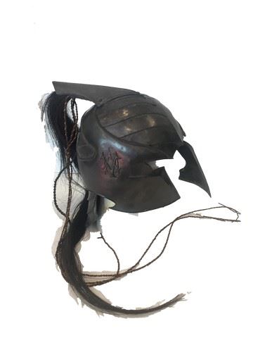 Screen used, plastic 'Death Dealer' helmet with face guard and long partially braided synthetic hair, insignia on both sides of the helmet. (13x11x8).